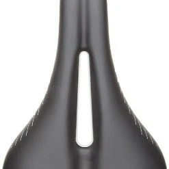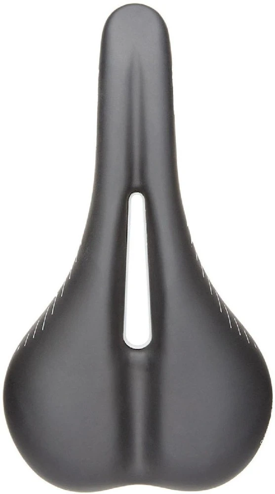 - Narrow profile with dropped nose shaping in front and relief channel throughout helps eliminate pressure; a flat rear supports sit bones